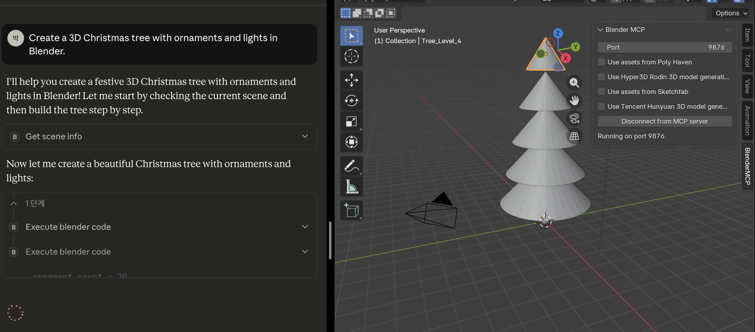 이제 Claude에게 Blender 작업을 음성/텍스트 명령으로 직접 실행할 수 있습니다