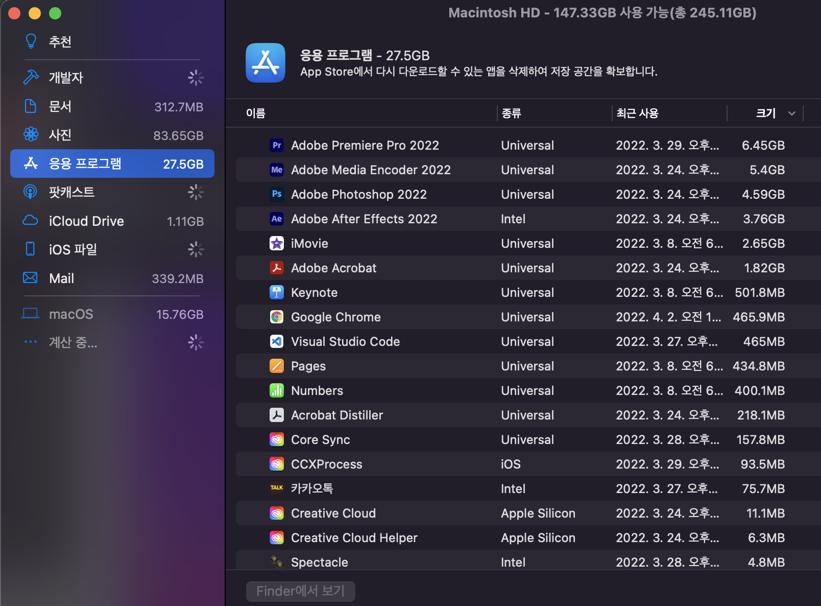 아래와 같은 창이 뜬다. 그다음 응용 프로그램을 클릭하면 이 맥에 설치된 응용 프로그램을 확인할 수 있는데
