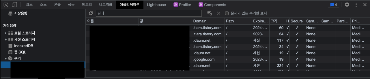 개발자도구 - 애플리케이션 탭에서 쿠키 값을 확인해 보면 Domain 탭이 있다
