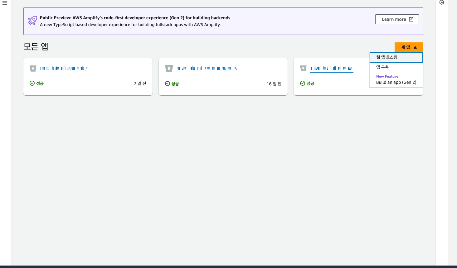 Amplify 페이지까지 왔다면 새 앱 버튼을 눌러 웹 앱 호스팅을 선택!